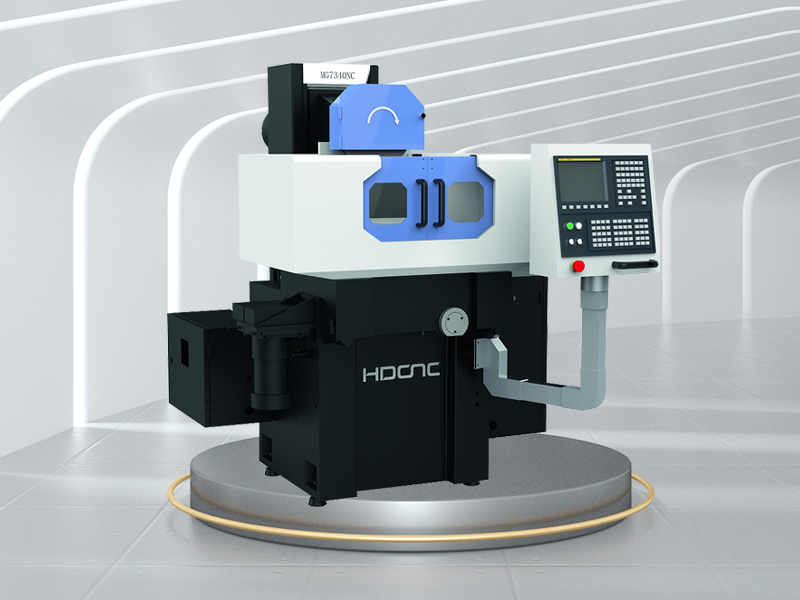 本机床采用十字拖板布局形式,前向导轨均贴有聚四氟乙烯软带,并由间歇润滑泵强制润滑,磨头主轴选用高精密角接触轴承,采用高刚性主轴套筒结构,回转精度高,使用维修方便。立柱采用双层壁结构,磨头主轴轴线平行于工作台面,卧式安装。工作台采用高精密静压转台,回转精度高,回转运动采用交流变频电机经齿型带驱动工作台;前后、上下轴进给采用高精密滚珠丝杠,AC伺服电机与数控系统,进刀灵敏度高,操作方便效率高。
